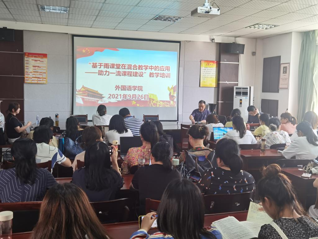 为了进一步推进课堂教学改革创新,提升教师智慧教学实践能力和混合式在线课程建设能力,9月26日下午,外国语学院举办“基于雨课堂在混合教学中的应用——助力一流课程建设”线下主题培训活动。外国语学院全体教师及部分英语专业学生参加了本次培训。