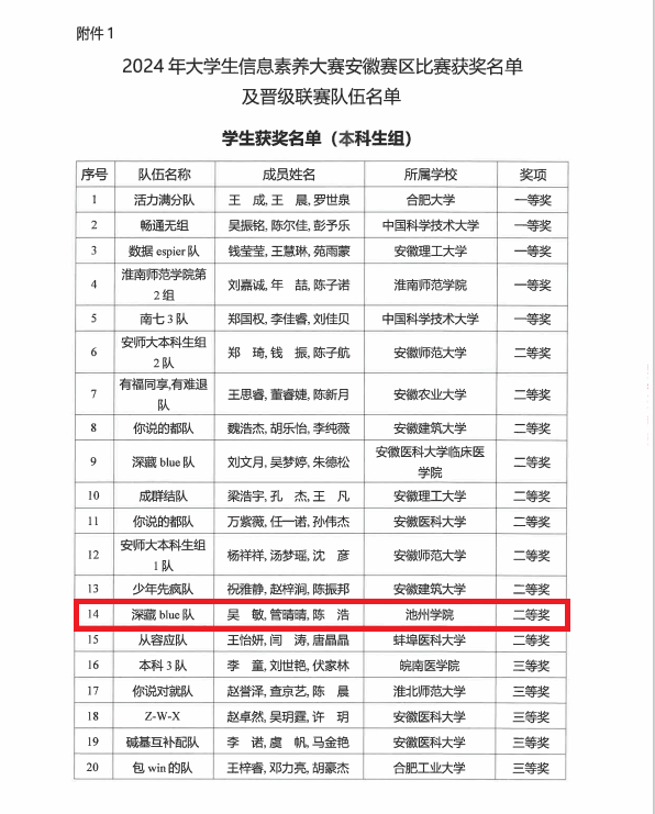 大赛于今年8月份正式启动,经过层层选拔和刻苦训练,PP电子由23级土地资源管理2班吴敏、23级汉语言文学2班管晴晴和计算机与科学技术2班陈浩三名同学组成的“深藏blue”队,代表学校参与省决赛。决赛中,参赛选手凭借敏锐的信息意识、熟练的信息检索技巧以及准确的信息分析和处理能力,取得了安徽赛区二等奖的优异成绩。