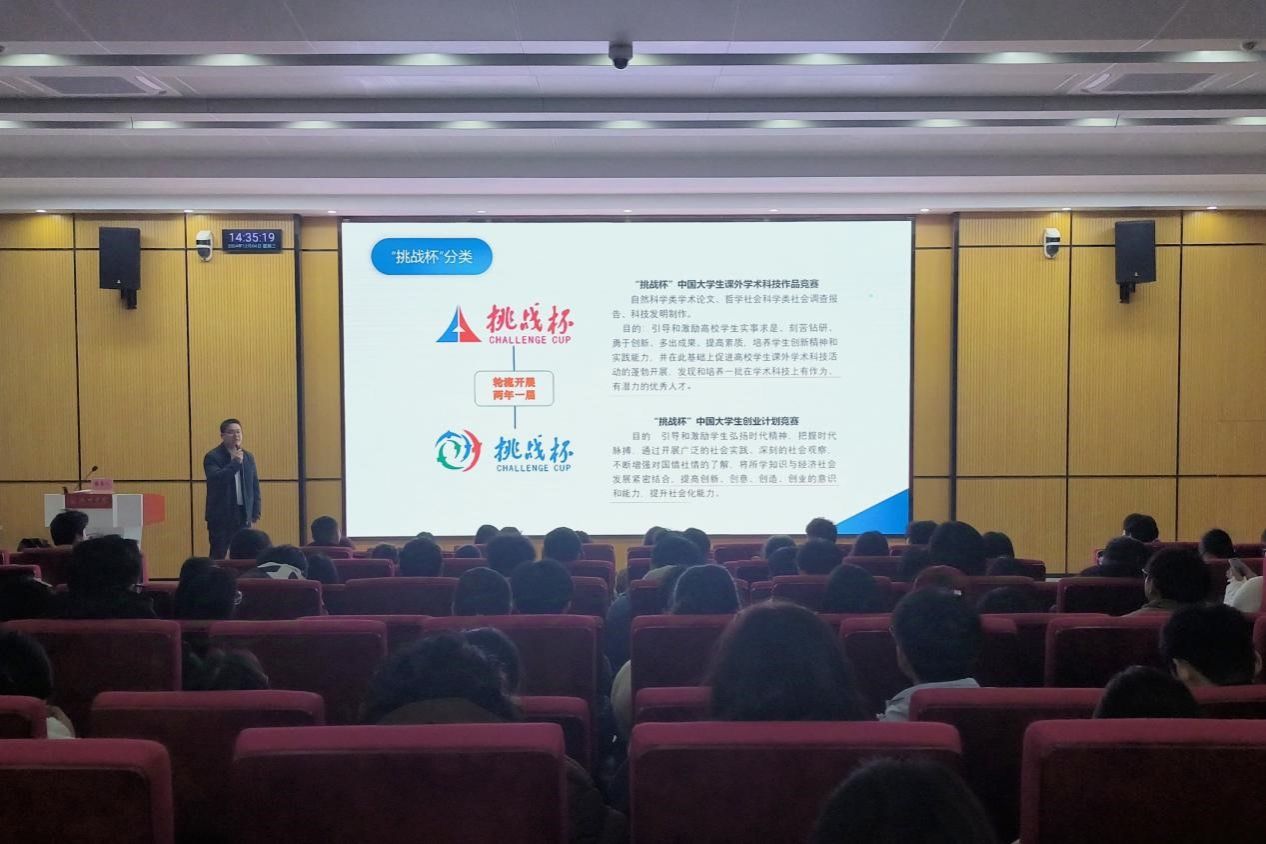 为扎实做好2025年“挑战杯”大学生课外学术科技作品竞赛备赛工作,营造浓厚竞赛氛围,12月4日下午,校团委在公教楼西报告厅举办“挑战杯”大学生课外学术科技作品竞赛培训会。中国管理科学学会科技成果转化专委会副秘书长、安徽省大学生创新创业促进会副秘书长许飞受邀担任本次培训会的主讲嘉宾,来自各二级学院的260余名师生代表参加培训。