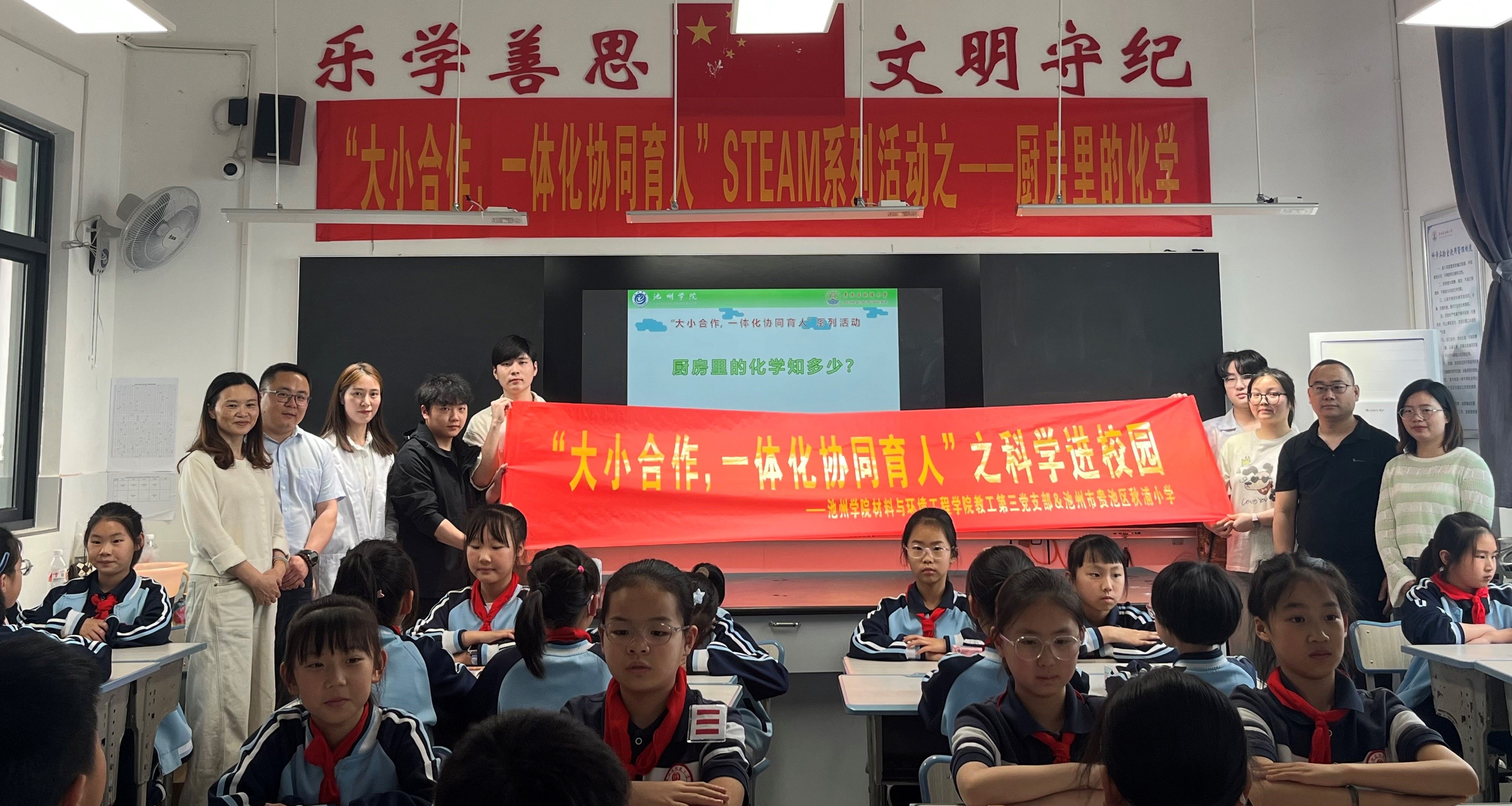 4月27日下午,材料与环境工程学院教工第三党支部赴池州市贵池区秋浦小学开展“大小合作,一体化协同育人”系列活动之“厨房中的化学”。活动由秋浦小学科学老师樊霞主持,材料与环境工程学院副院长昌杰、肖新乐、学生第二党支部党员师生代表以及秋浦小学四年级师生代表参加了活动。