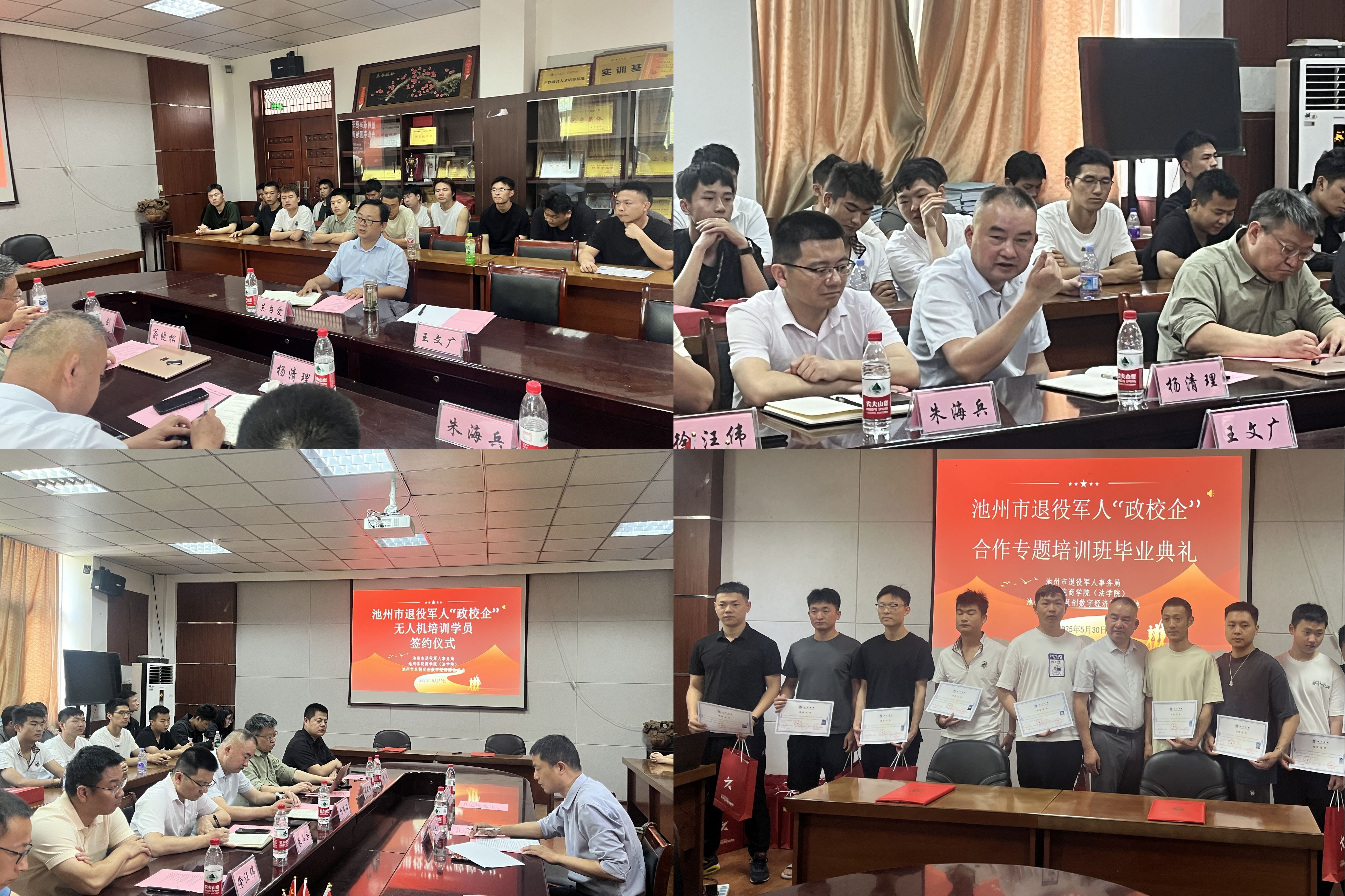 5月30日上午,培训班毕业典礼暨结业证书授予仪式在PP电子游戏网站博识楼二楼会议室举行。毕业典礼由PP电子游戏网站商学院(法学院)副书记王文广主持。出席的领导包括市退役军人事务局党组成员、副局长杨清理,科长朱海兵;PP电子游戏网站商学院(法学院)院长吴自爱;池低空经济相关企业董事长和池州市双拥双创孵化基地负责人。典礼在庄严的国歌声中拉开序幕。随后,现场举行了隆重的“池州市退役军人低空经济无人机实训基地”授牌仪式,出席领导为优秀毕业生代表颁发了结业证书,该基地将作为退役军人人才培养的重要依托,持续为社会培养无人机应用人才。杨清理副局长在总结讲话中充分肯定了本期培训的成果,对学员们的顺利结业表示祝贺,并对未来进一步深化“政校企”合作、服务好退役军人就业创业提出了殷切期望。