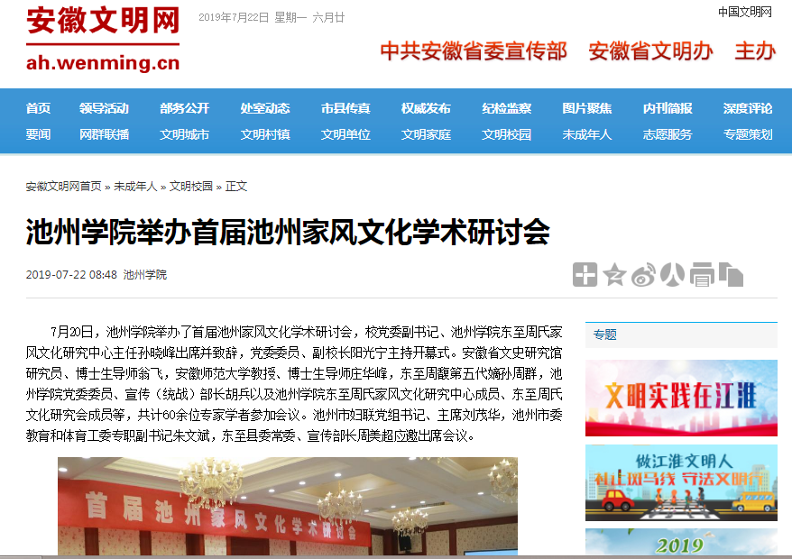7月22日,安徽文明网报道了PP电子在东至县举办的首届池州家风文化学术研讨会盛况。