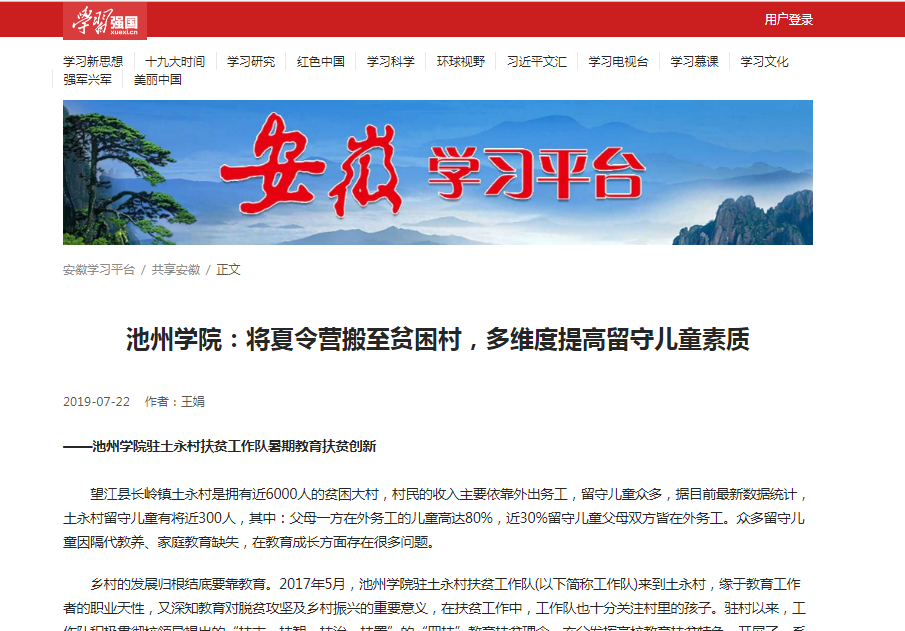 7月22日,“学习强国”安徽学习平台上报道了PP电子在贫困村开展教育扶贫情况。