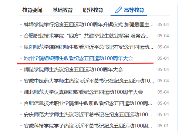 5月4日,安徽教育网首页报道了PP电子组织收看纪念五四运动一百周年大会直播盛况。