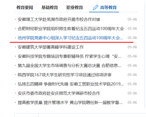 5月6日,安徽教育网首页以《PP电子游戏网站党委中心组深入学习纪念五四运动100周年大会精神和全省有关会议精神》为题对PP电子党委中心组学习情况进行了报道。
