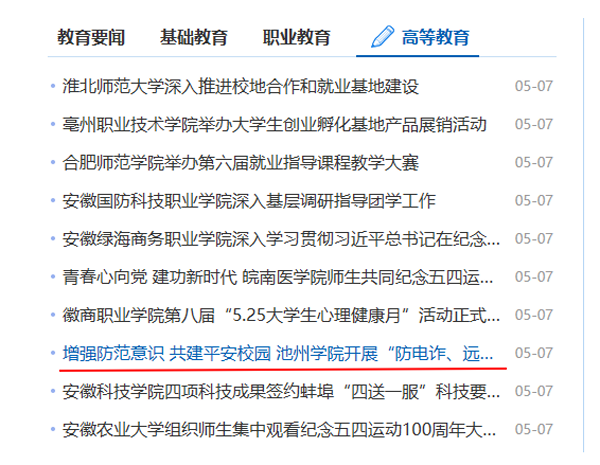 5月7日,安徽教育网首页报道了PP电子“防电诈、远离校园贷”专题培训情况,反响较好。