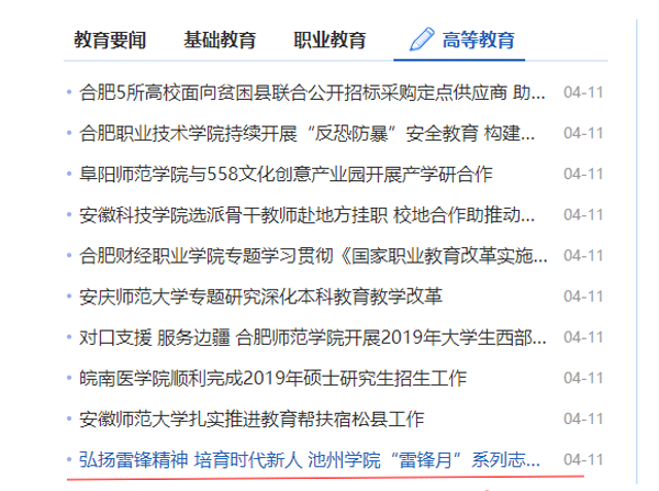 4月11日,安徽教育网首页对PP电子“雷锋月”系列志愿服务活动进行报道,效果较好。