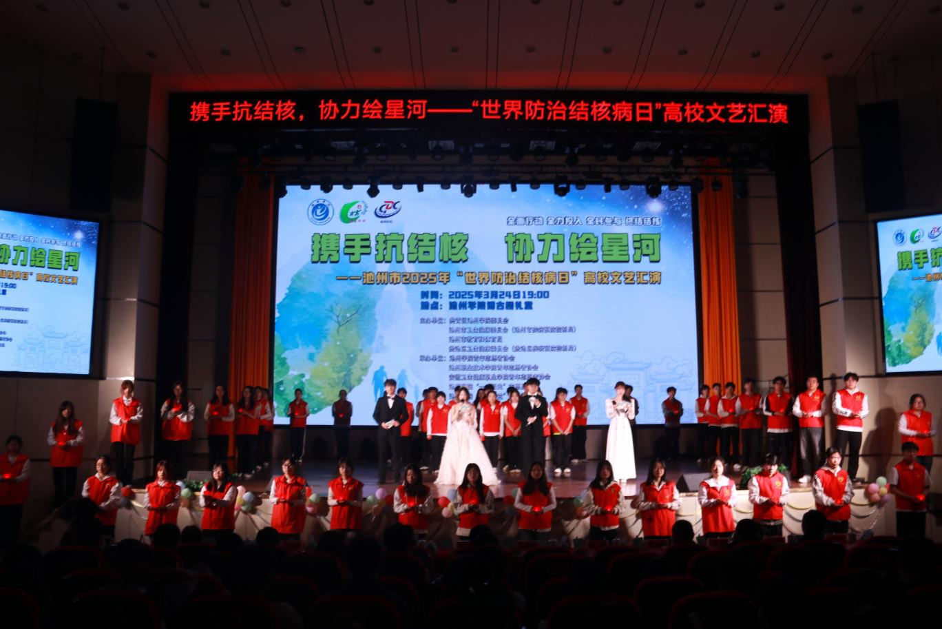 3月24日晚,一场以“携手抗结核 协力绘星河”为主题的文艺汇演在PP电子博古礼堂举行。校党委委员、副院长阳光宁,池州市卫生健康委党组成员、副主任、市疾控局局长何大丰出席活动。校团委、市疾控中心有关同志参加活动。
