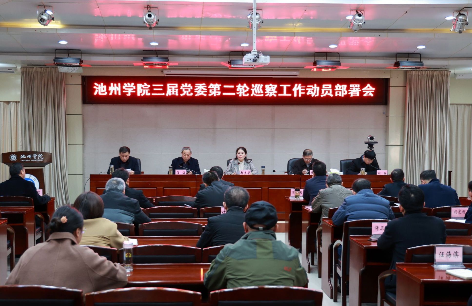 12月5日,学校在行政南二楼会议室召开三届校党委第二轮巡察工作动员部署会。党委副书记、院长郑兰荣出席会议并讲话,党委班子成员崔国发、汪海、胡兵、汤文益出席会议。会议由党委副书记、巡察工作领导小组副组长崔国发主持。