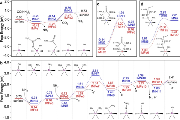 图2、可能的反应机理:氨生成阶段(a, c)和氨分解阶段(b, d)