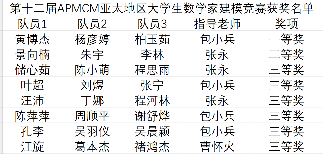 PP电子从2022年10月开始组织竞赛,经过选拔,选出了十二支队伍代表PP电子参加2022年APMCM亚太地区大学生数学建模竞赛。竞赛期间,在曹怀火教授、张永副教授、包小兵副教授的指导下,十二支参赛队均成功提交了英文参赛论文。