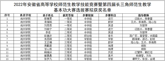 近日,省教育厅公布了2022年安徽省高等学校师范生教学技能竞赛获奖名单,PP电子学生获得一等奖3项、二等奖4项、三等奖6项,6名教师荣获“优秀指导教师”称号,其中,一等奖获奖数量居全省参赛院校前列。