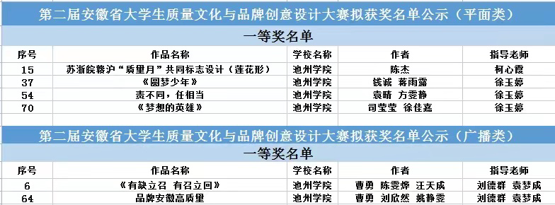 其中,文学与传媒学院推荐的作品《圆梦少年》(作者:钱诚和蒋雨露,指导老师:徐玉婷)、《责不同,任相当》(作者:袁晴和方雯静,指导老师:徐玉婷)、《梦想的英雄》(作者:司莹莹和徐佳嘉,指导老师:徐玉婷)和艺术与教育学院推荐的作品《苏浙皖赣沪“质量月”共同标志设计》(作者:陈杰,指导老师:柯心霞)荣获平面类一等奖;校广播台推荐的《有缺立召有召立回》(作者:曹勇、刘欣然、姚静雯,指导老师:刘德群、袁梦成)、《品牌安徽高质量》(作者:曹勇、陈雯烨、汪天成,指导老师:刘德群、袁梦成)荣获广播类一等奖。