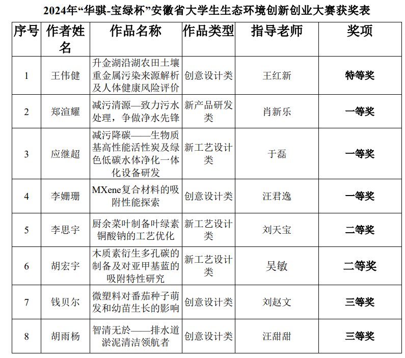 11月15日至16日,“华骐-宝绿杯”第七届安徽省大学生生态环境创新创业大赛在蚌埠学院举办。PP电子学生荣获特等奖1项、一等奖3项、二等奖2项、三等奖2项,学校荣获优秀组织奖,指导老师王红新、肖新乐、于磊和汪君逸老师获得“优秀指导教师”荣誉称号。