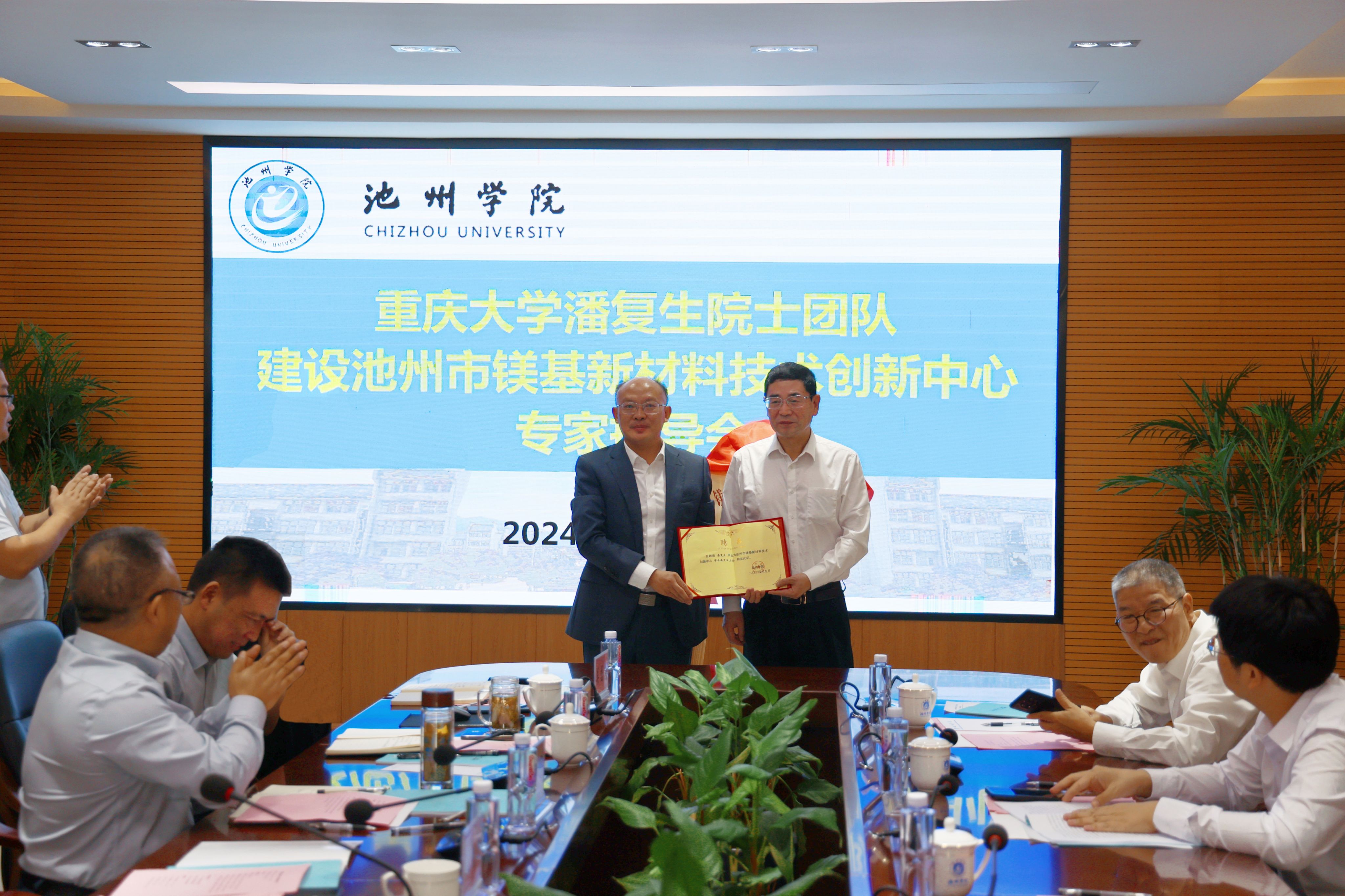 王先柱向潘复生院士颁发池州市镁基新材料技术创新中心学术委员会主任聘书。