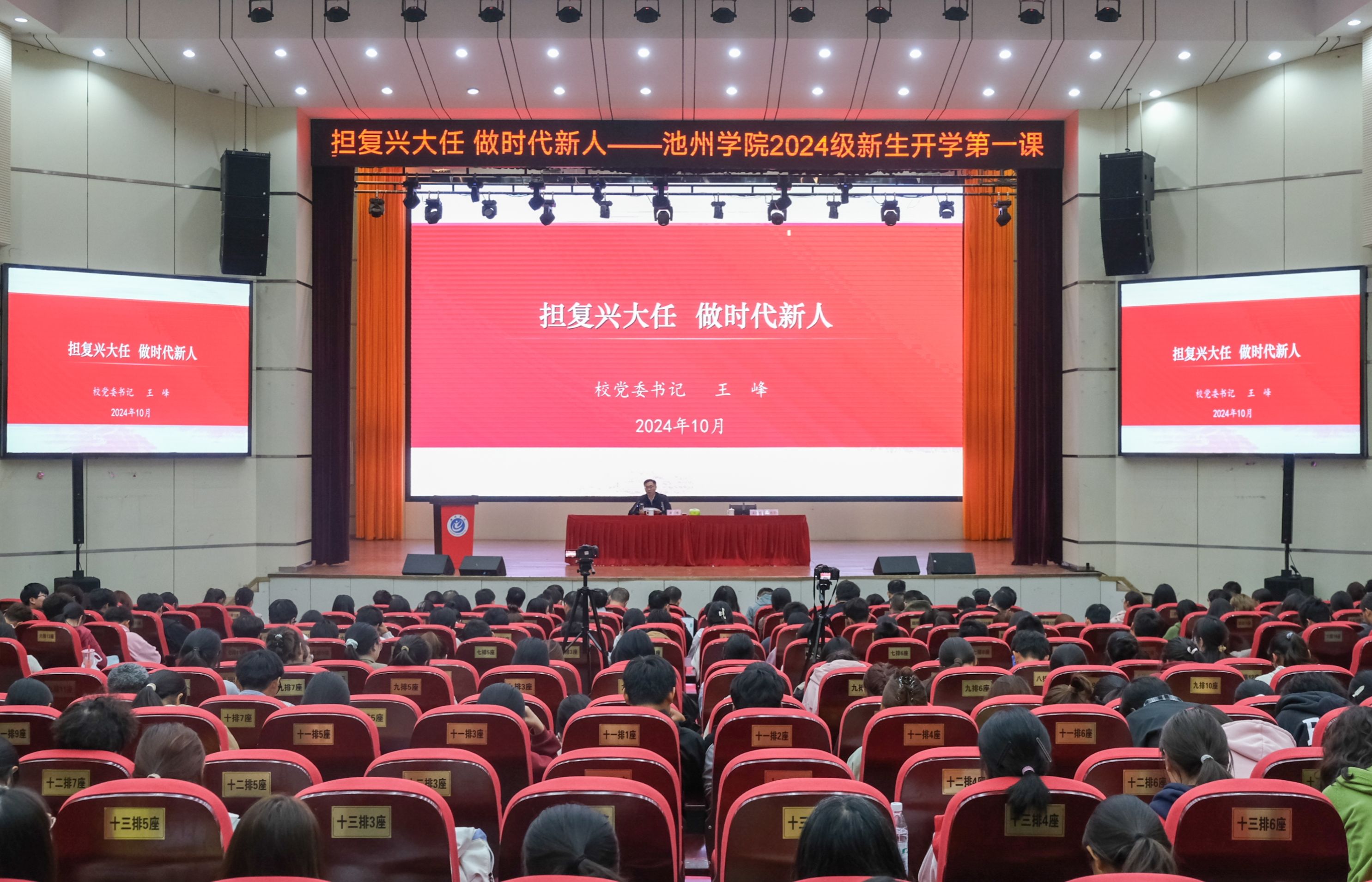 10月29日晚,校党委书记王峰以《担复兴大任,做时代新人》为题,为2024级新生讲授“开学第一课”。校党委委员、副校长阳光宁主持开学第一课。