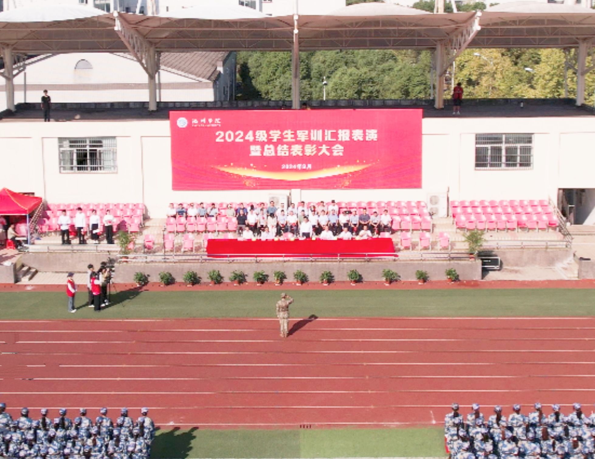 9月30日上午,学校举行2024级新生军训汇报表演暨总结表彰大会。校党委书记王峰向承训部队赠送锦旗,校党委副书记、校长王先柱作总结讲话。校党委班子成员阳光宁、吕刚、张赛、胡兵及承训部队上尉周梓曦在主席台就坐。大会由校党委委员、副校长阳光宁主持。