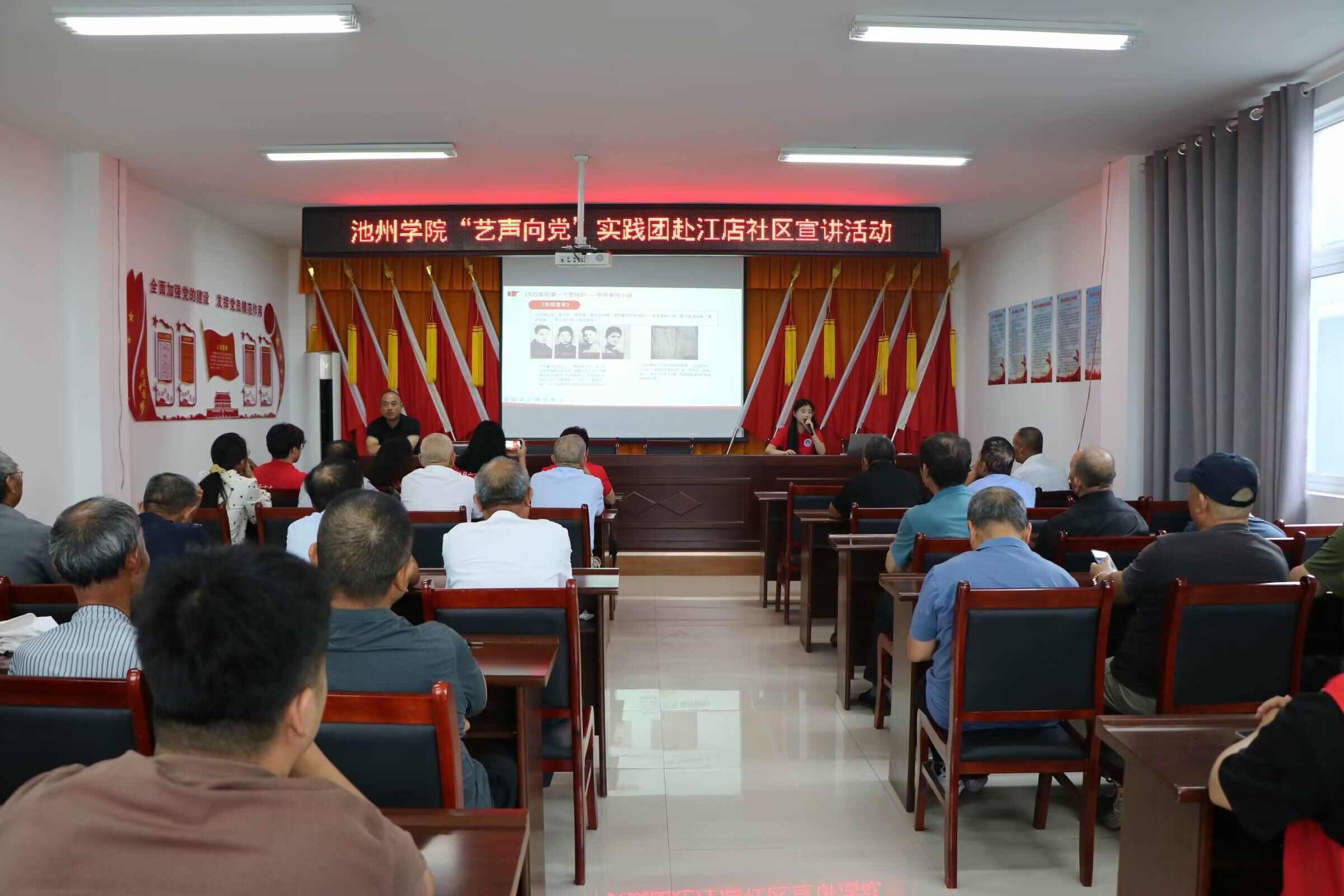 7月10月至15日,艺术与教育学院“艺声向党”实践团前往阜阳市博物馆、史志馆、革命烈士纪念馆和“四九”起义纪念馆等场所参观学习,亲身感受革命先烈们的英勇事迹和崇高精神。实践团先后来到阜阳市袁寨镇江店社区、阜阳艺翔文化艺术中心、阜阳市山河之家健康养老社区和阜阳市颍泉区爱乐合唱团,以红色文化音乐会的形式,结合掌握的史料和参观学习后的心得感悟进行生动讲解,带领大家回首峥嵘岁月、回顾红色记忆,激励大家从丰富的党史宝库中汲取奋进力量。实践团还与颍泉区委党校的相关老师就如何通过艺术创作来增强党性教育和党性修养进行了交流学习,进一步加深了对传承和弘扬红色党史的认识。