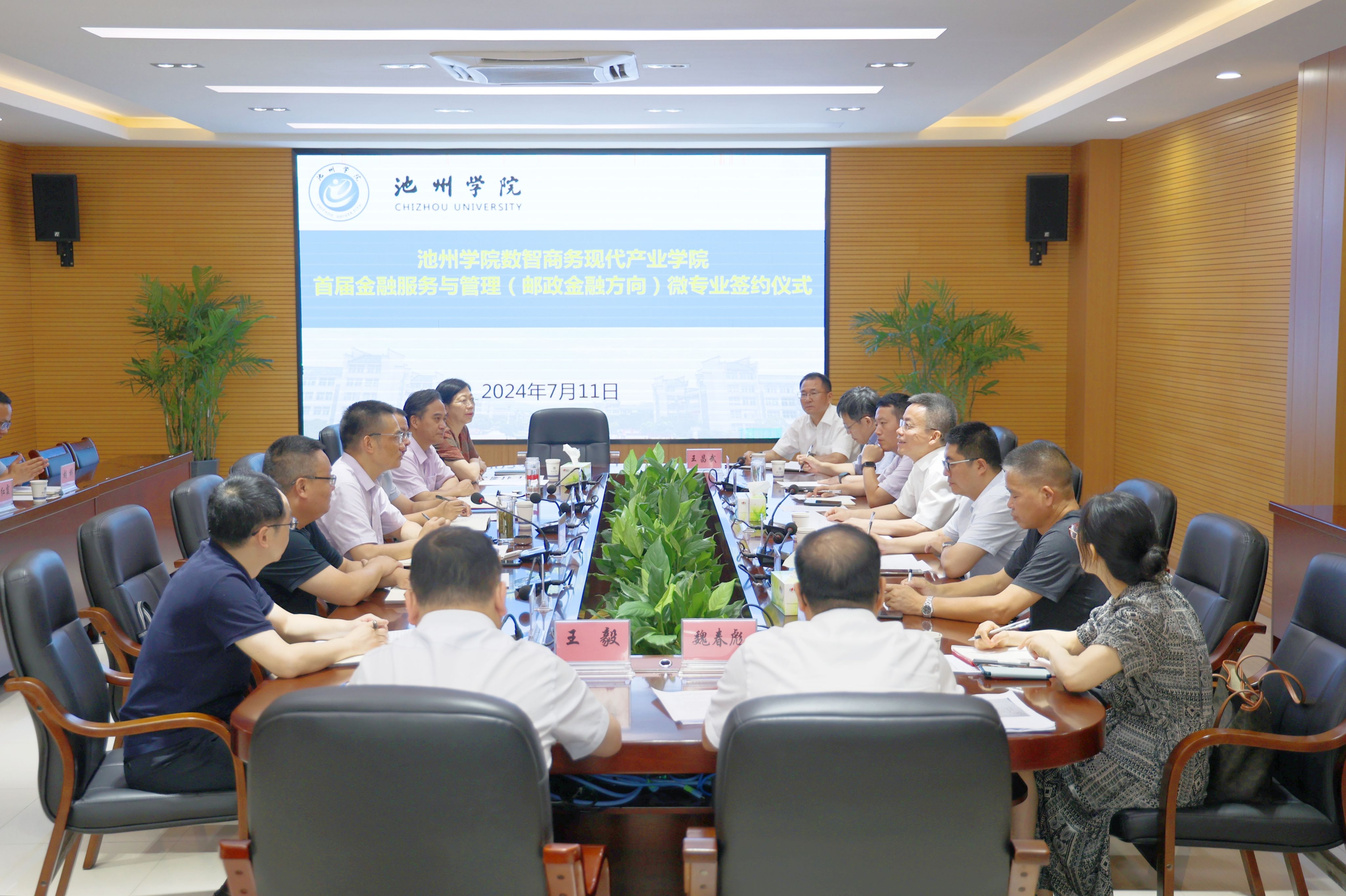 7月11日,学校举行首届金融服务与管理(邮政金融方向)微专业签约仪式。校党委委员、副院长吕刚,中国邮政集团有限公司安徽省分公司党委委员、副总经理刘文骏出席。池州市相关部门负责人,PP电子人事处、学生处、教务处、商学院以及石家庄邮电职业技术学院金融学院相关负责人参加会议。