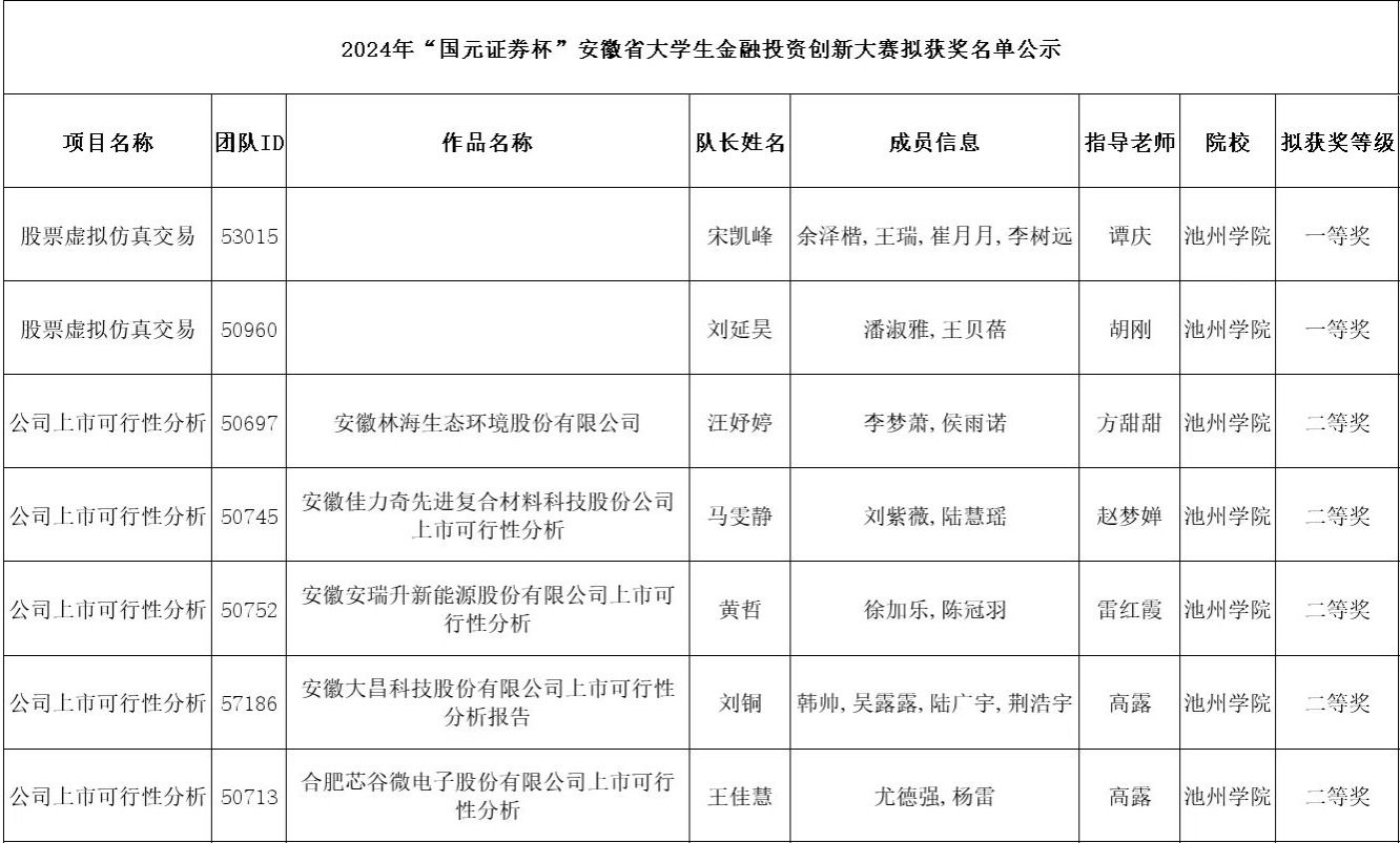 7月8日,2024年安徽省“国元证券杯”大学生金融投资创新大赛结果揭晓。PP电子学子荣获一等奖2项,二等奖11项,三等奖22项,学校获优秀组织奖。