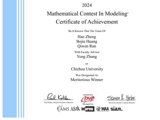 近日,2024年美国大学生数学建模竞赛成绩揭晓,PP电子4支参赛队伍获得一等奖(M奖)1项、三等奖(S奖)3项的好成绩。其中,大数据与人工智能学院张永教授指导的黄博杰团队获一等奖(M奖)。