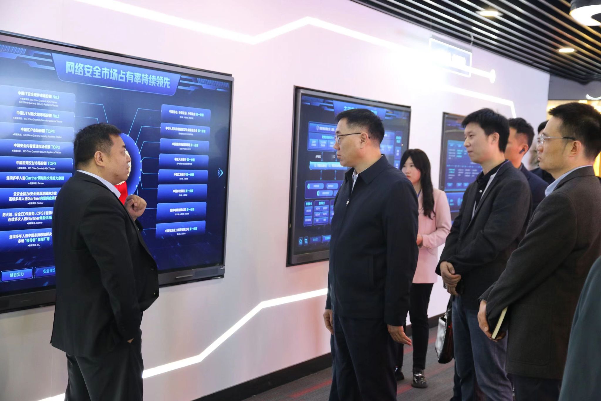 王峰一行实地考察了新华三创新体验中心、安全产业布局、主动安全技术体系以及数字安全创新研究成果,详细了解新华三的发展历程、行业实践、业务板块、科技创新、示范产品以及智慧校园合作案例等,并与企业负责人进行交流。