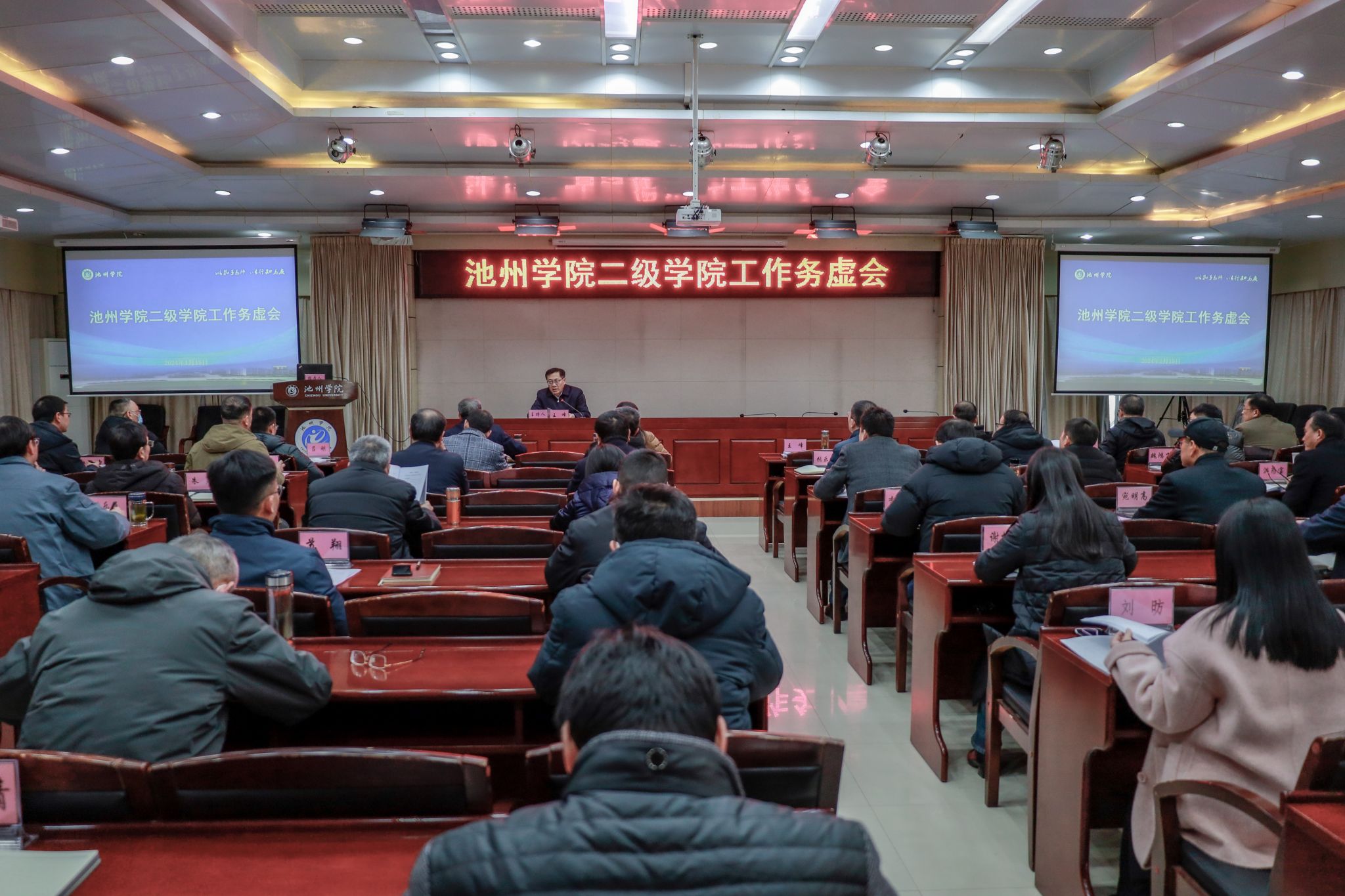 1月15至16日,学校在办公楼南二楼会议室召开2023年二级学院工作务虚会,总结2023年工作,谋划2024年发展思路和工作方向。党委书记王峰主持会议,校领导郑兰荣、崔国发、汪海、阳光宁、吕刚、张赛出席会议。