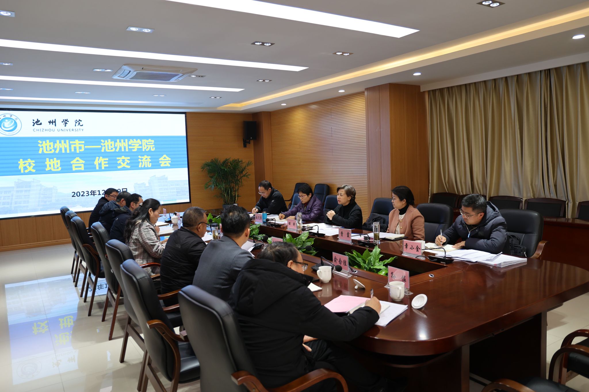 池州市教育和体育局局长刘茂华,池州经济开发区党工委委员、党群工作局局长钱志华,池州市教育和体育局副局长章小金,PP电子教务处、科研处、大数据与人工智能学院、机电工程学院(半导体学院)、材料与环境工程学院主要负责人参加会议。