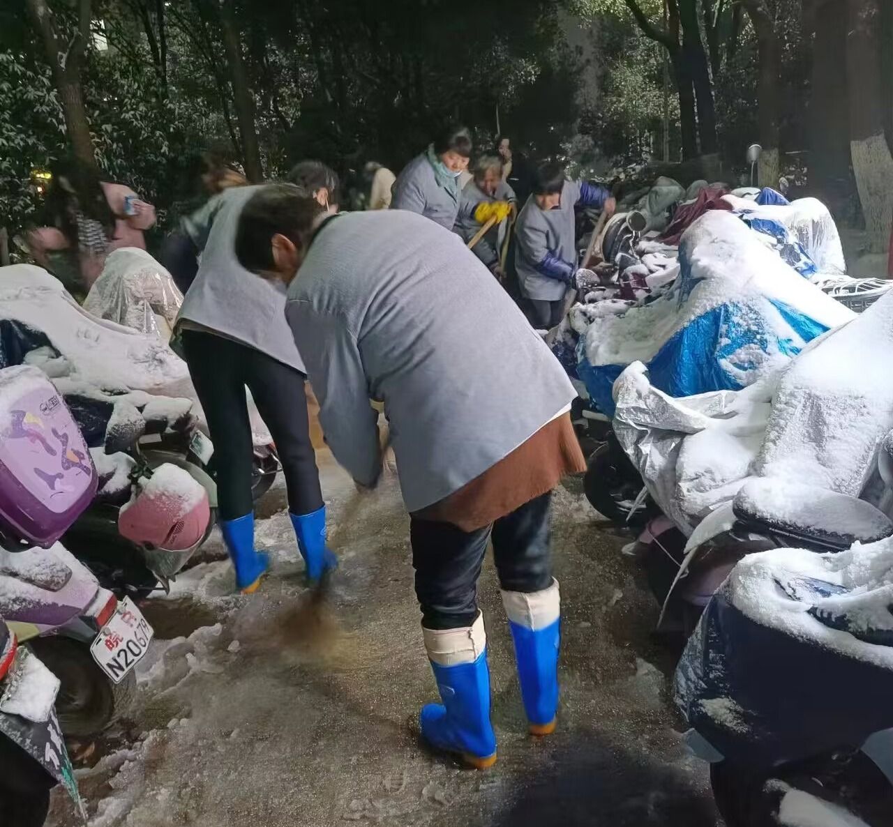 为确保除雪工作快速顺利完成,18日晚,党委委员、副院长张赛靠前指挥,带领后勤管理与基建处对校园区域进行分片包干清理。物业、宿管、食堂和超市工作人员等连夜对责任区进行清雪。因路面压实、结冰等因素,清雪难度大,但这些都丝毫不影响大家清雪的热情,教学区楼宇进出口、校园主干道、学生公寓进出口、食堂进出口及周边都是大家忙碌的身影。大家手持铁锹、扫帚,争先恐后,铁锹与地面撞击的锵锵声音,和着扫雪的沙沙声,弹奏出一曲安全和谐之歌。经过3个多小时的连续奋战,凌晨时分学校重点区域和主干道路积雪已基本清扫干净。