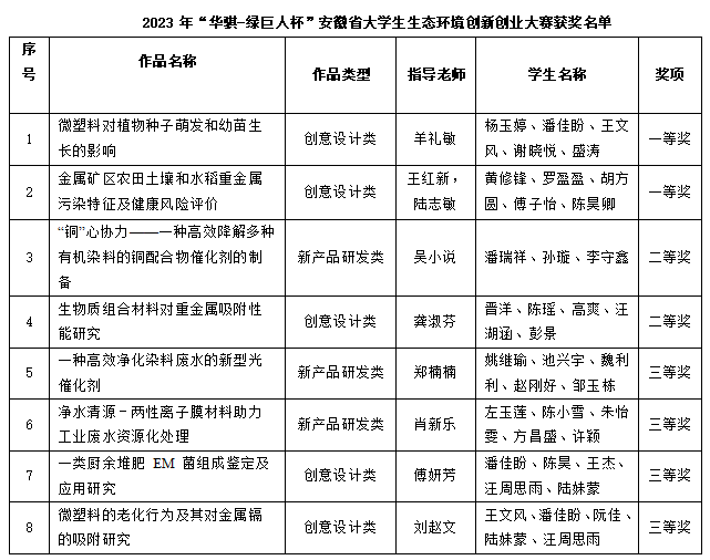 11月24日至25日,安徽省大学生生态环境创新创业大赛决赛在安庆师范大学举办。PP电子代表队荣获一等奖2项、二等奖2项、三等奖4项的优异成绩,学校荣获优秀组织奖,羊礼敏、王红新和陆志敏老师荣获优秀指导教师奖。