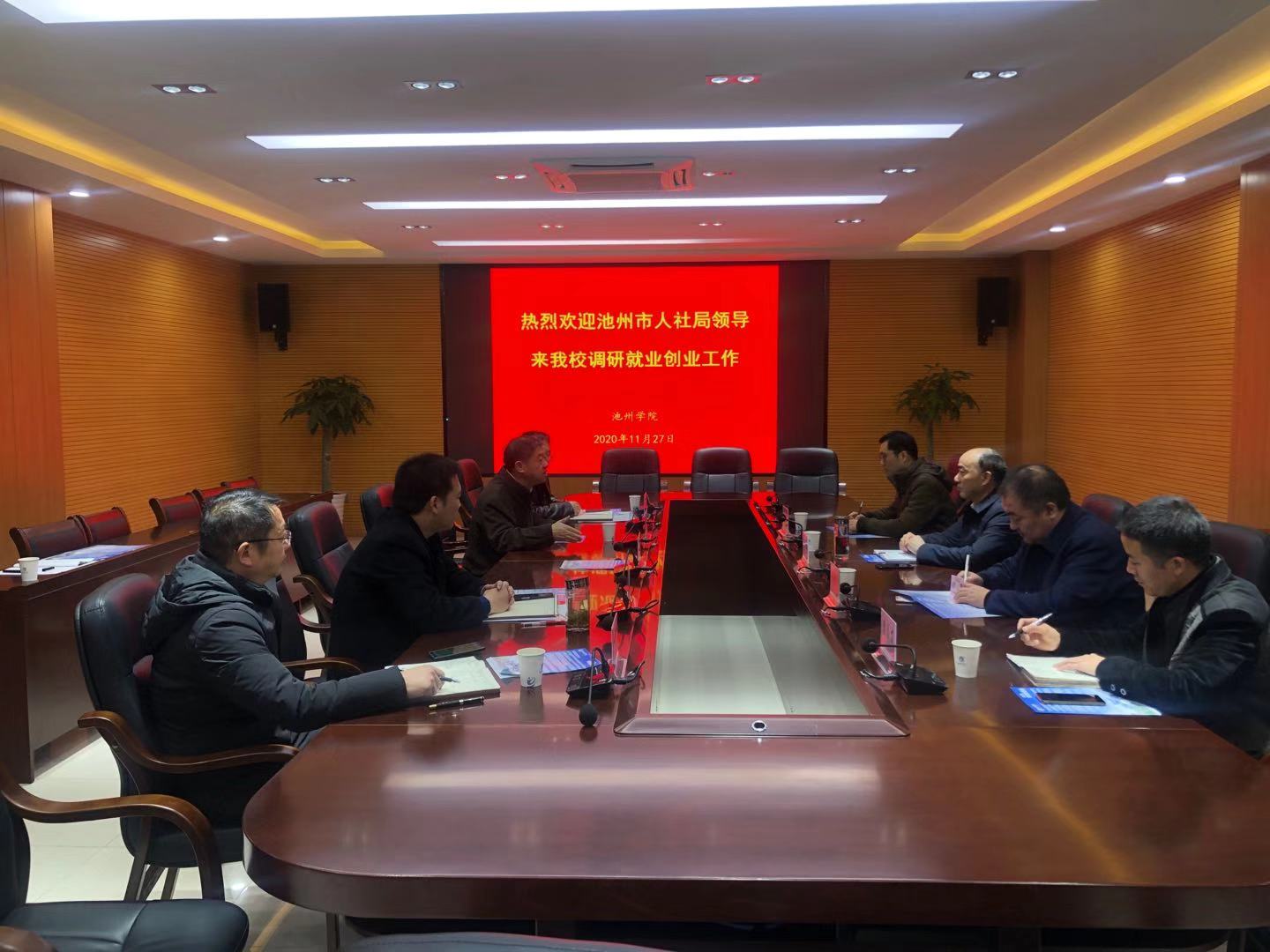 11月27日上午,池州市人力资源和社会保障局局长汪茂耀一行四人来PP电子开展就业创业工作专项调研。校党委副书记崔国发主持会议并讲话。