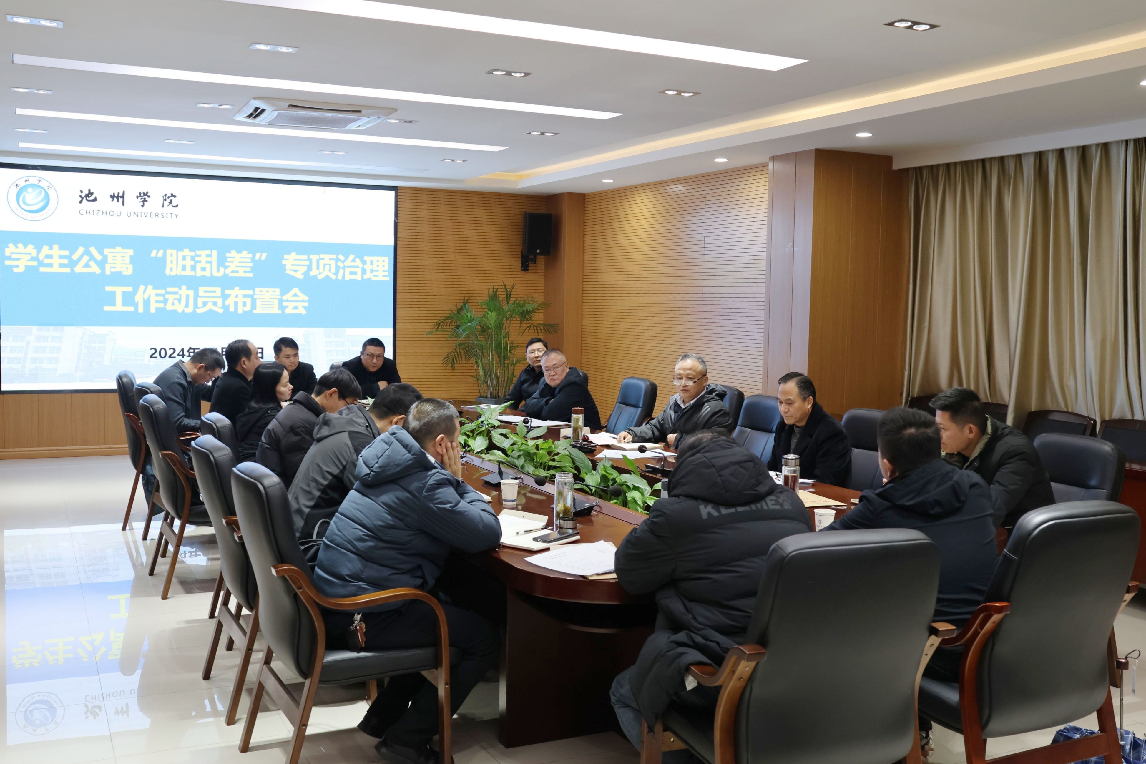 12月11日,学校在办公楼北二楼会议室召开学生公寓“脏乱差”专项治理工作动员布置会,推进学生文明行为规范养成和优良校风学风建设,以营造整洁舒适、文明有序的学习生活环境。党委委员、副院长阳光宁主持会议并讲话。相关职能部门及各二级学院负责人参加会议。