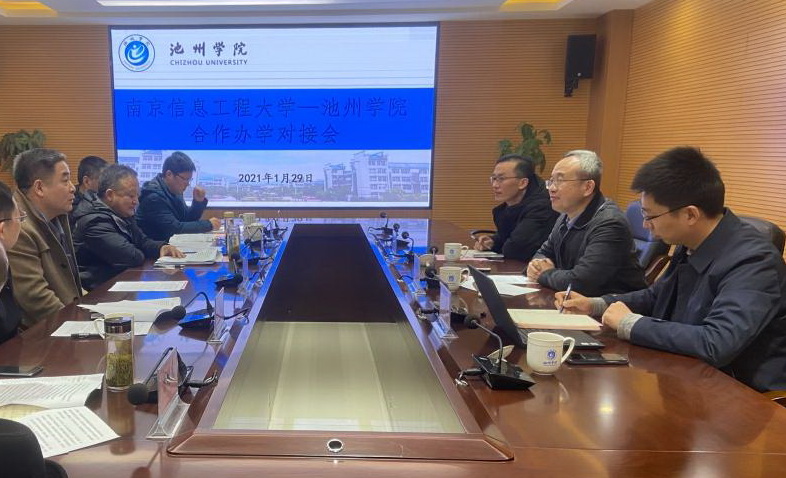 1月29日上午,南京信息工程大学党委常委、总会计师胡明保一行3人来PP电子对接磋商合作办学事宜。校长柳友荣出席了座谈会并讲话,副校长阳光宁、汪贤才出席了活动。