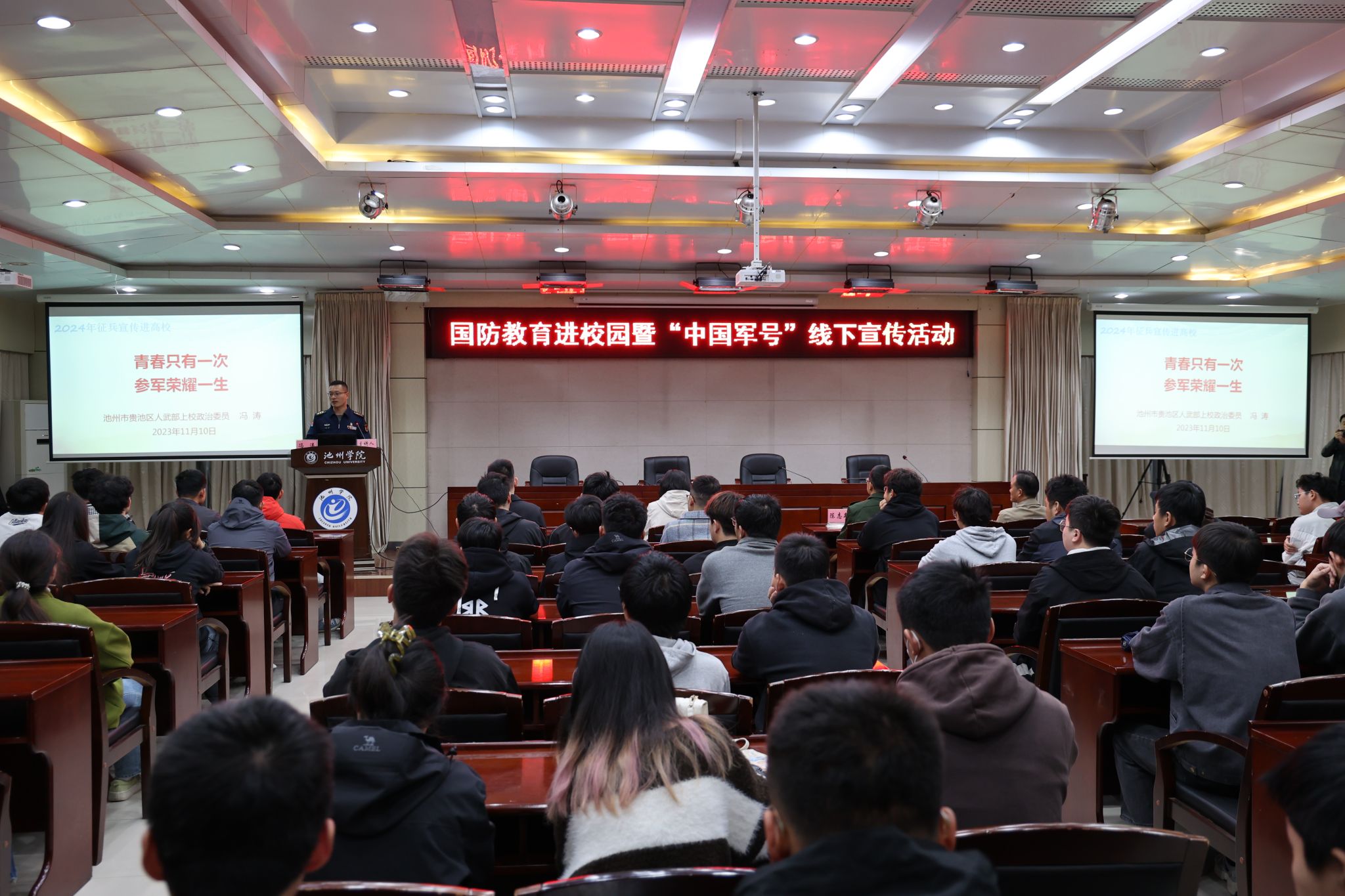 活动现场,贵池区人武部政委冯涛结合个人入伍经历,以《青春只有一次,参军荣耀一生》为题,详细解读了与大学生切身利益息息相关的入伍相关政策。