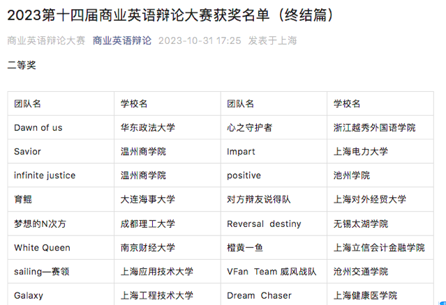 10月27日-28日,第十四届“高教社杯”商业英语辩论大赛决赛在上海举行。外国语学院2021级商务英语2班朱冰洁、方若珩、叶丽兰三位同学(指导老师:陈倩、姚瑶)从复赛66支队伍中脱颖,荣获全国二等奖。