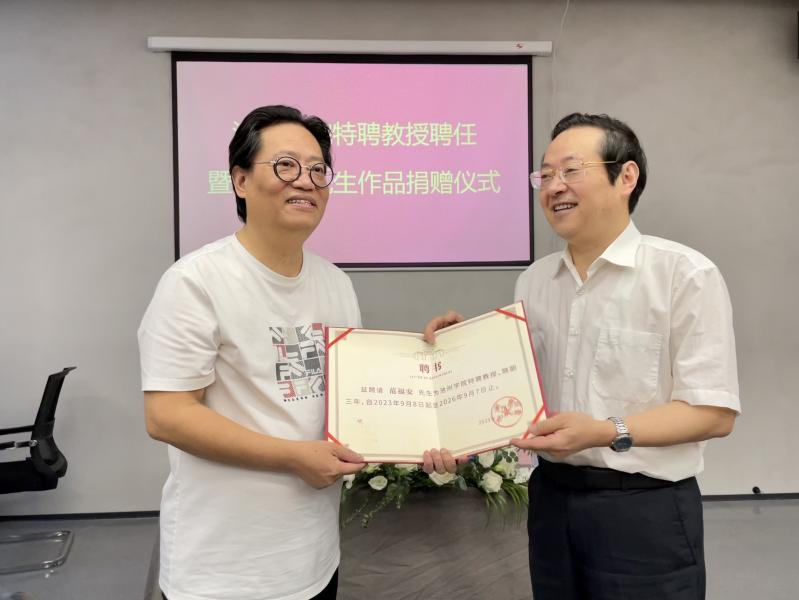 孙晓峰向范福安颁发了特聘教授证书和作品收藏证书。范福安向学校捐赠了由其本人创作的漆画作品。