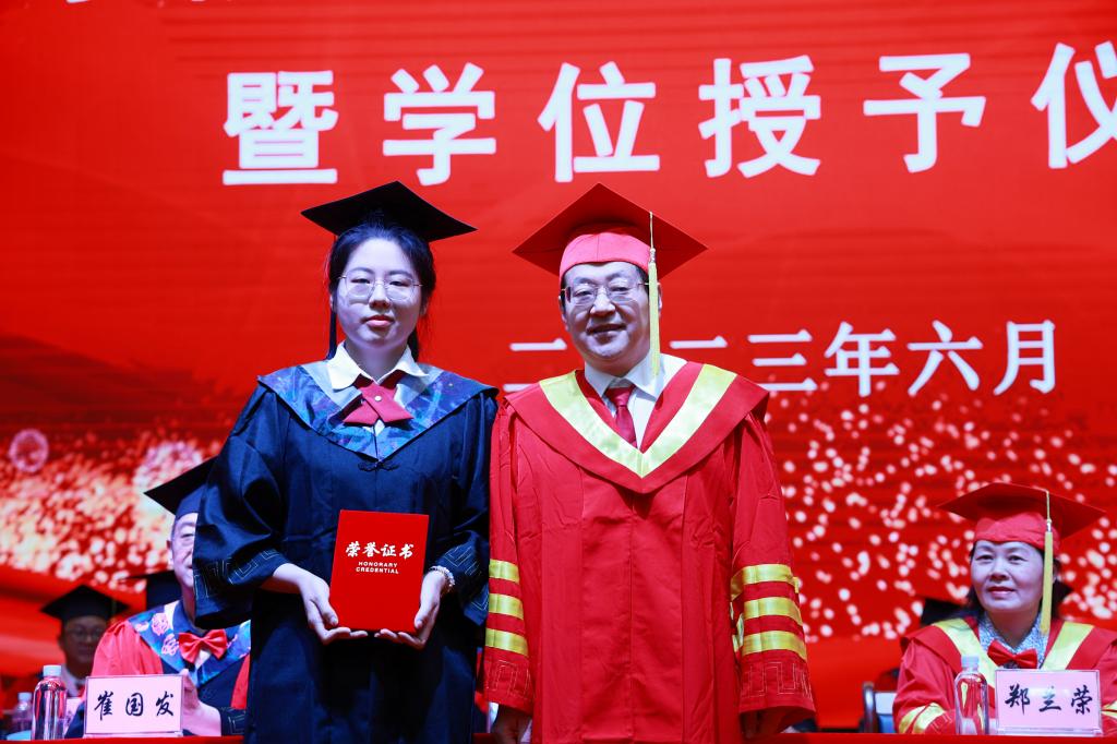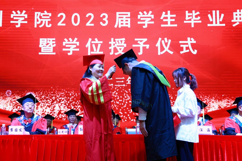 党委副书记、院长郑兰荣为毕业生代表拨穗、颁发学位证书。