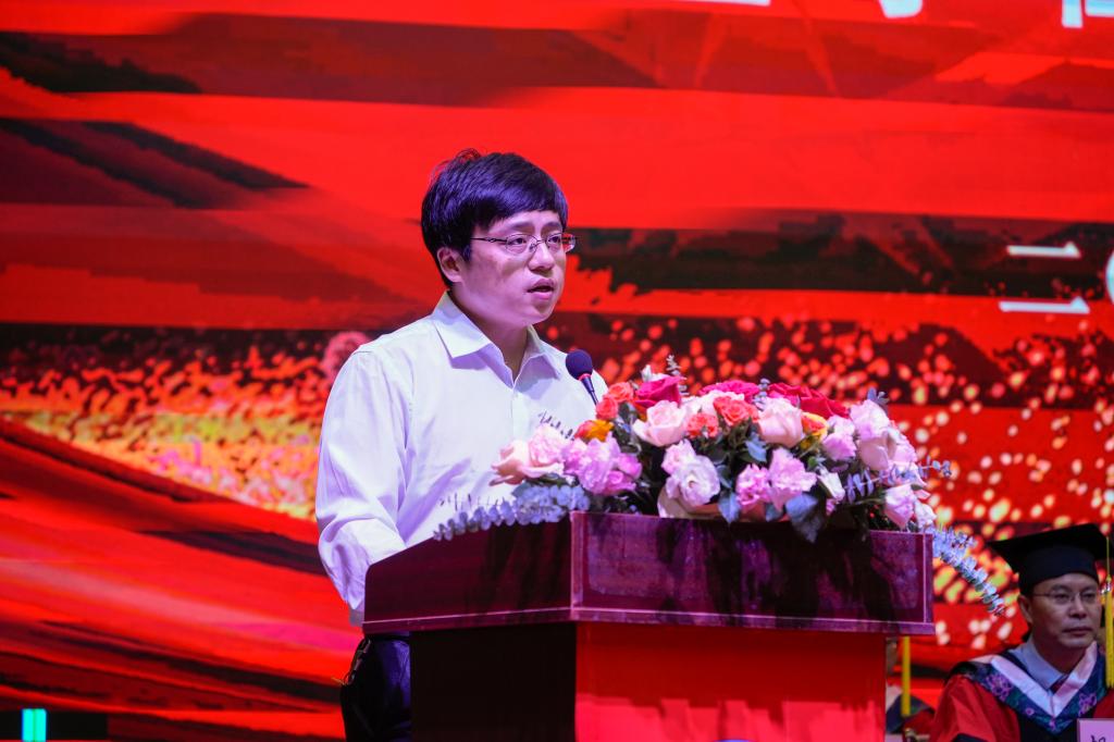 大数据与人工智能学院的吴燚老师代表教师发言,表达了母校及教师对全体毕业生的牵挂与不舍,也为2023届全体毕业生送上了祝福和期望,希望大家能牢记师长教诲,在新征程上努力创造新成绩,来回报母校和老师。