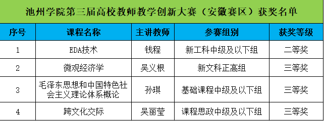 近日,第三届全国高校教师教学创新大赛安徽省决赛落下帷幕,PP电子参赛选手在大赛中表现优异,斩获二等奖1项、三等奖3项,创造了PP电子在该项赛事中的最佳成绩,其中机电工程学院(半导体学院)钱程教师团队荣获新工科中级及以下组二等奖、商学院吴义根教师团队荣获新文科正高组三等奖、马克思主义学院孙琪教师团队荣获基础课程中级及以下组三等奖、外国语学院吴丽莹教师荣获课程思政中级及以下组三等奖。