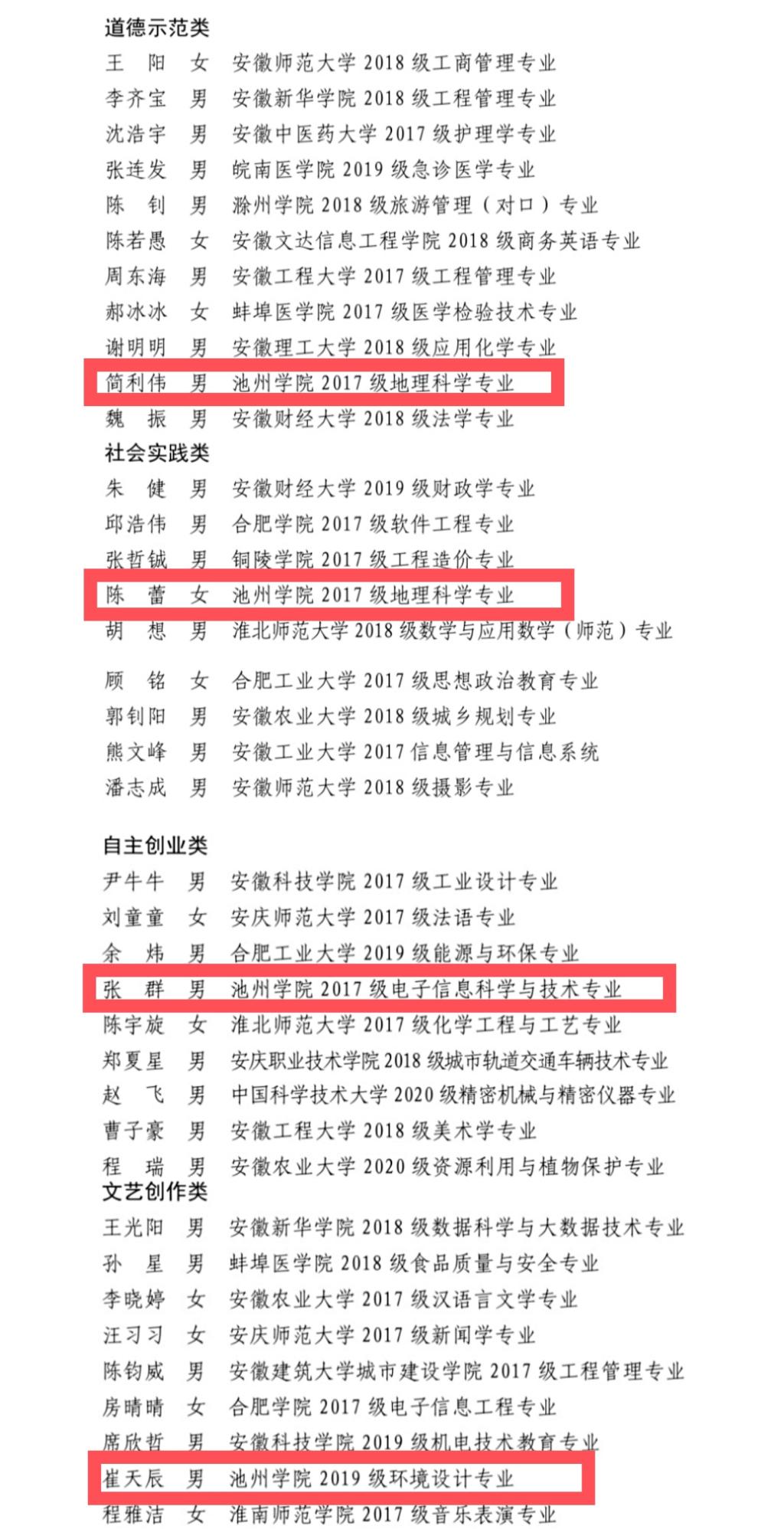 近日,2020年度“安徽省十佳大学生”选树工作圆满落幕,PP电子简利伟、陈蕾、张群、崔天辰分别获得道德示范类、社会实践类、自主创业类、文艺创作类“安徽省百优大学生”荣誉称号。