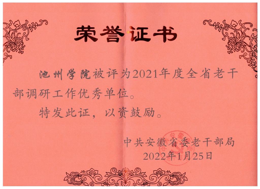 根据中共安徽省委老干部局《关于确定2021年度全省老干部调研工作优秀单位的通知》(皖老通字[2022]2号)和《关于2021年度全省优秀调研成果通报和2022年调研工作的通知》(皖老通字[2022]11号)等文件,PP电子荣获2021年度全省老干部调研工作优秀单位,离退休工作处潘桂莲同志《推进新时代老干部党建工作的思考与探索——PP电子游戏网站党建引领推动老干部工作高质量发展》的调研报告荣获2021年度全省老干部工作优秀调研成果。退休干部徐健同志创作的书法作品“虎踞龙盘今胜昔,天翻地覆慨而慷”入选全省老干部系统庆祝中国共产党成立100周年“伟大的旗帜”书画展,作品入编《伟大的旗帜·全省老干部系统庆祝中国共产党成立100周年书画作品集》。