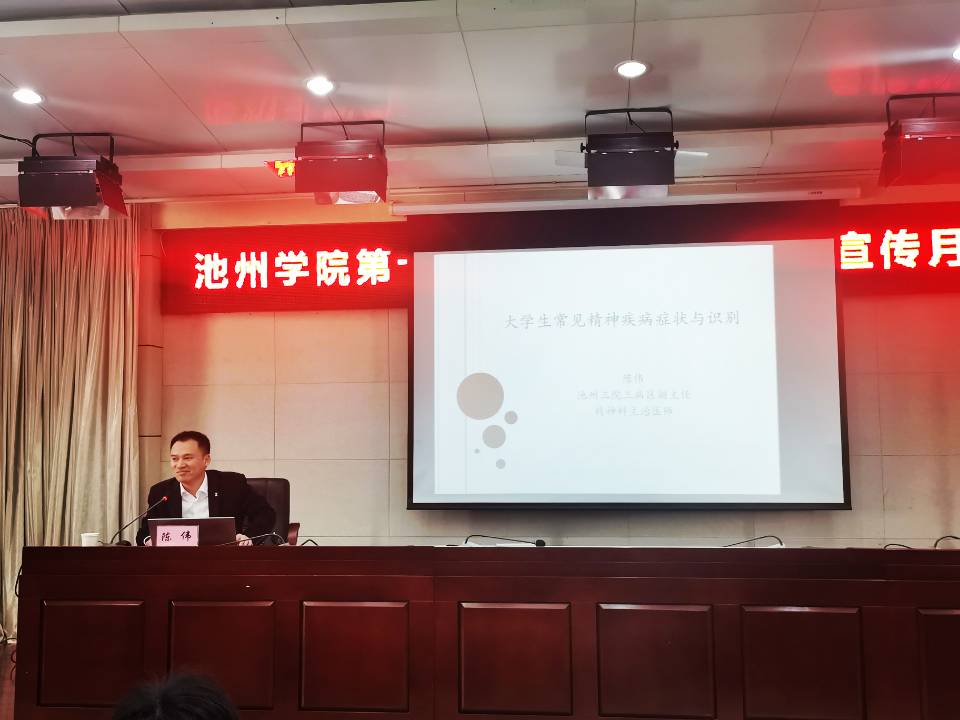启动仪式结束后,池州市第三人民医院主治医师陈伟为现场师生作了题为《大学生常见精神疾病症状与识别》科普知识讲座。