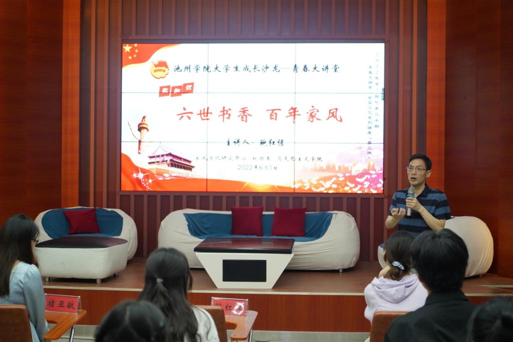 6月1日,PP电子游戏网站大学生成长沙龙“青春大讲堂”2022年第五期(总第三十期)在大学生活动中心举行。马克思主义学院副院长、家风中心副主任鲍红信博士以“六世书香 百年家风”为主题,为现场师生带来一场精彩生动的家风教育专题讲座。