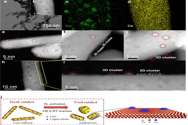 图2 15CuCe催化剂240 h稳定性测试后的结构表征。a TEM图像; b-d STEM图像和元素映射结果; e-h HAADF-STEM图像; i (h)中突出显示区域的放大图像; j铜-二氧化铈催化剂在长期稳定性测试过程中的结构演化示意图。