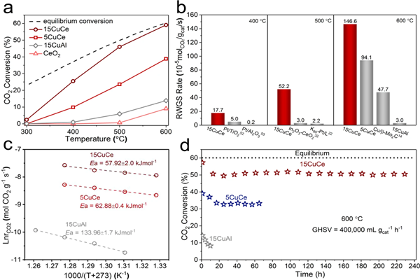 图1铜-二氧化铈催化剂在RWGS反应中的催化性能。a CeO2、5CuCe、15CuCe和15CuAl催化剂的活性; b不同催化剂在400°C、500°C、600°C的反应速率比较; c不同催化剂的表观活化能值; d 5CuCe、15CuCe催化剂和参考15CuAl催化剂的长期催化测试。