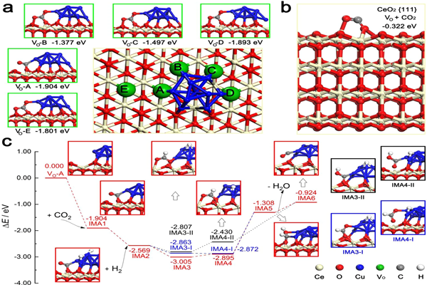 图3铜-二氧化铈催化剂上RWGS反应的反应路径。a CO2在10Cu/CeO2{111}表面的化学吸附。对以VO-A至VO-E命名的5个氧空位进行比较,发现所选的CO2位于VO-A附近; b CeO2{111}表面CO2与VO结合的吸附能明显弱于Cu滴在二氧化铈位点; c RWGS反应机理发生在VO-A上。红、蓝、黑三色线分别表示不同的反应路径,红、蓝、黑三色笔画的结构图分别对应反应路径。