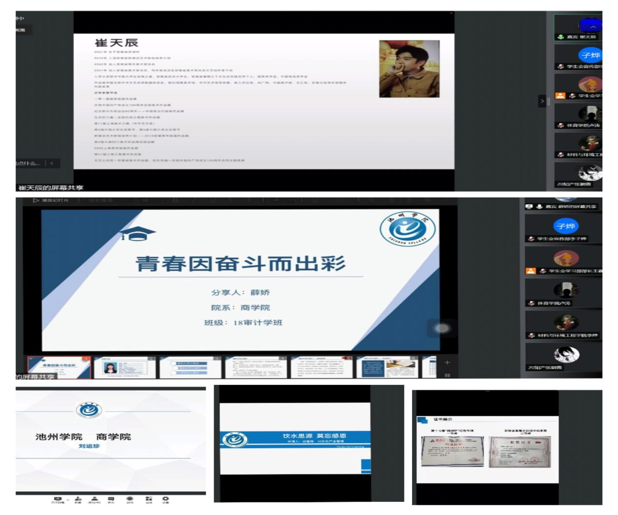 艺术与教育学院2019级环境设计专业崔天辰、商学院2018级审计学专业薛娇、商学院2019级电子商务专业刘运珍、外国语学院2019级英语专业杨君杰、旅游与历史文化学院2019级文化产业管理专业白雪雨五位主讲人结合PPT课件分别从理想树立、课程学习、技能拓展、社会实践等多方面分享自己的学习和成长经历。在互动环节,嘉宾们耐心解答同学们的问题,给出自己的观点和建议,同时鼓励广大同学们要坚定理想信念,明确学习目标,参与社会实践,丰富自身素养,用奋斗和汗水绘出自己的青春底色。