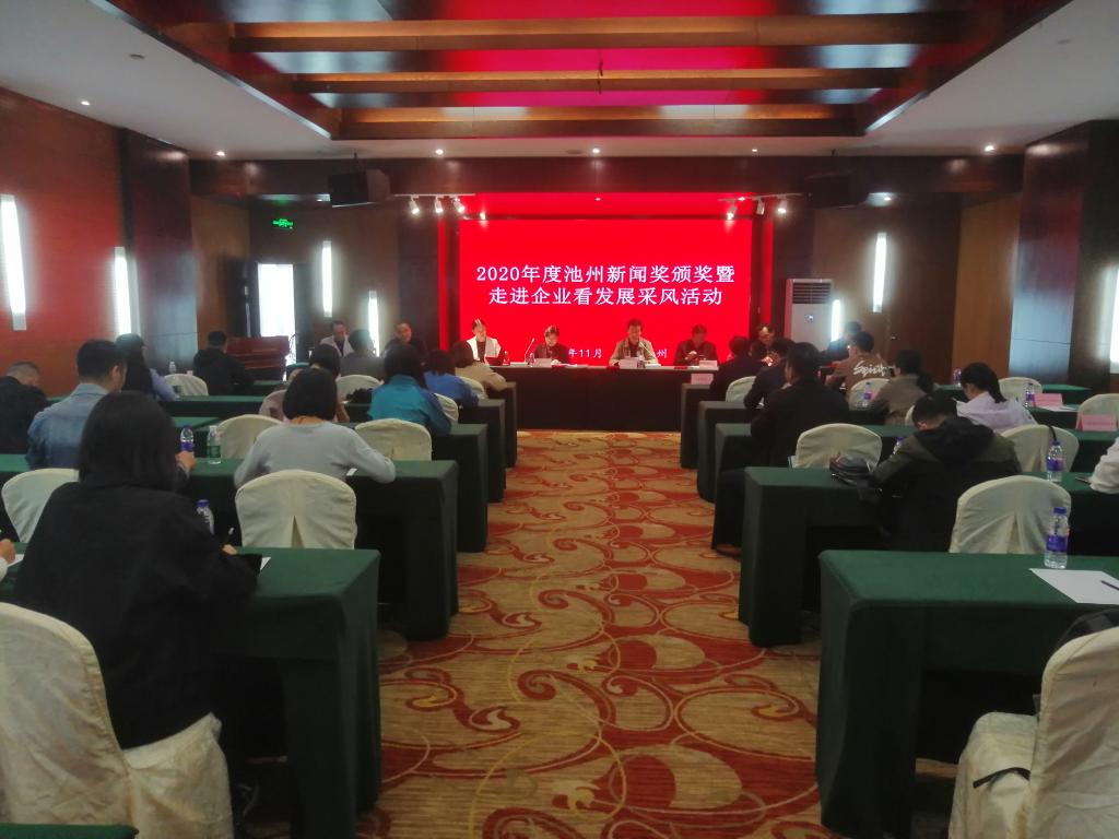 11月3日,池州市2020年度新闻奖颁奖仪式在东榕大酒店举行,PP电子报送作品《校地共植“致富菊”》(作者:袁梦成)荣获报刊类三等奖。池州市委宣传部常务副部长章文静,池州日报社党组书记、社长左宗伟等出席颁奖仪式,并为获奖人员颁奖。