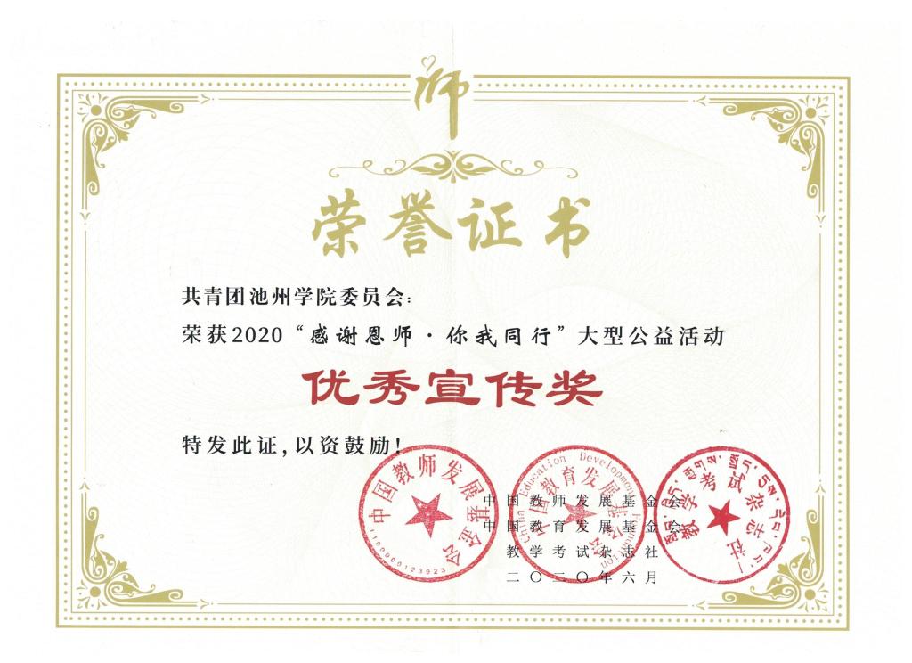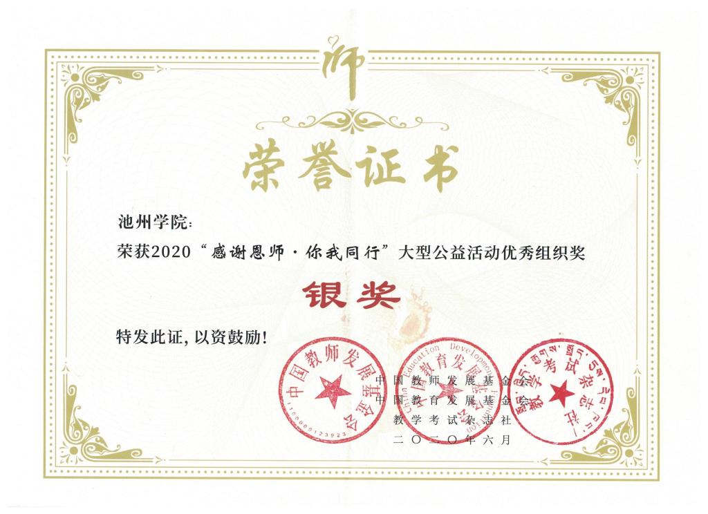 近日,2019年度“感谢恩师·你我同行”大型公益活动圆满结束,PP电子荣获全国“优秀组织奖银奖”、全国“优秀宣传奖”等荣誉称号,文学与传媒学院叶静同学荣获全国“优秀传承奖”,外国语学院周红同学、旅游与历史文化学院陈蓉同学荣获“优秀感恩大使”荣誉称号。