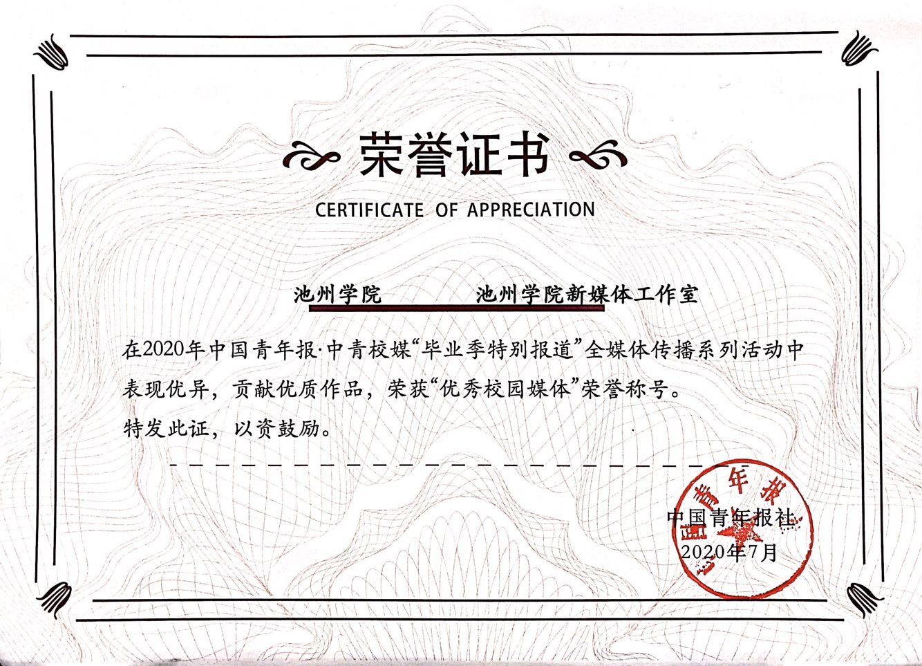 由中国青年报·中青校媒举办的2020年“毕业季特别报道”全媒体传播系列活动中,PP电子新媒体工作室积极参与,制作优质作品,并荣获了“优秀校园媒体”荣誉称号。